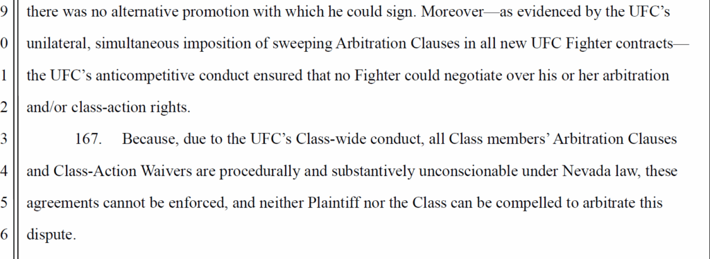 The Complaint appears to be a mirror image of the Le and Johnson cases. However, this one is updated to encompass fighters who had signed the arbitration agreement and waiver amendment to fighter contracts.