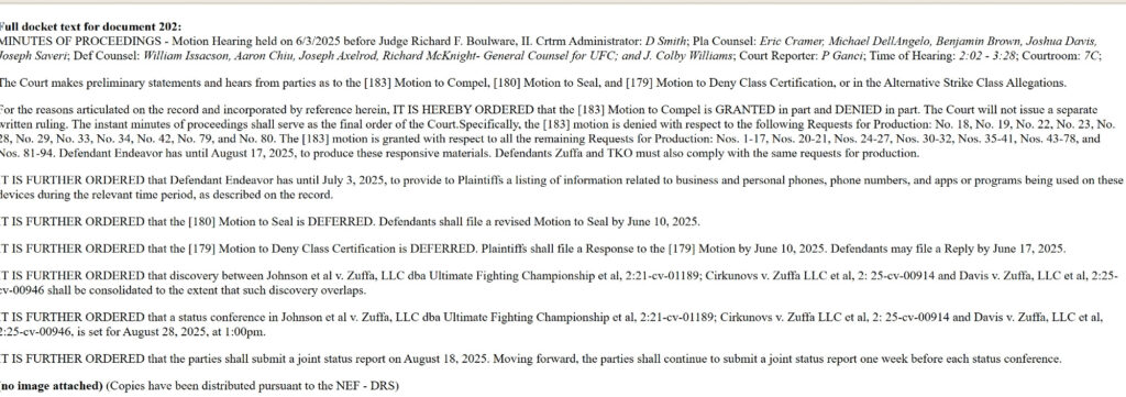 For those interested on the Court ruling in the Kajan Johnson lawsuit last week, Judge Boulware punted on most rulings. No ruling on Class Certification as that question is being deferred. Another status conference will be held 08/28/25 #UFC #Zuffa
