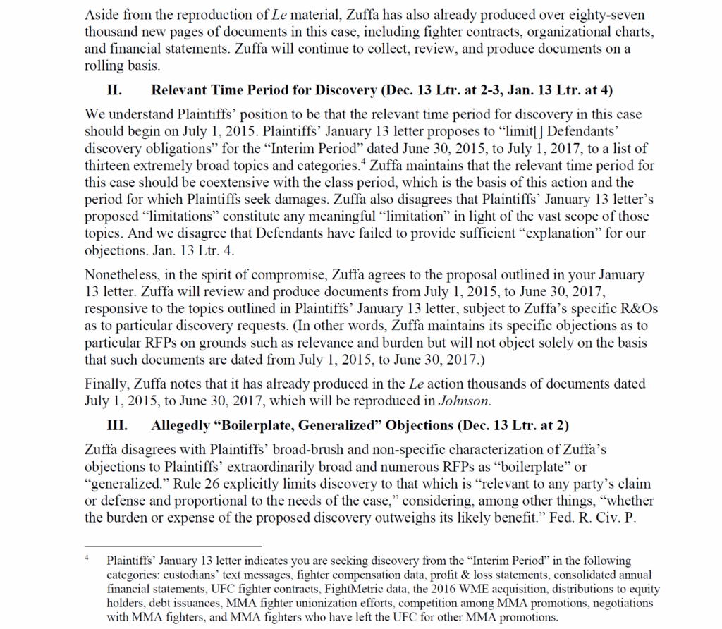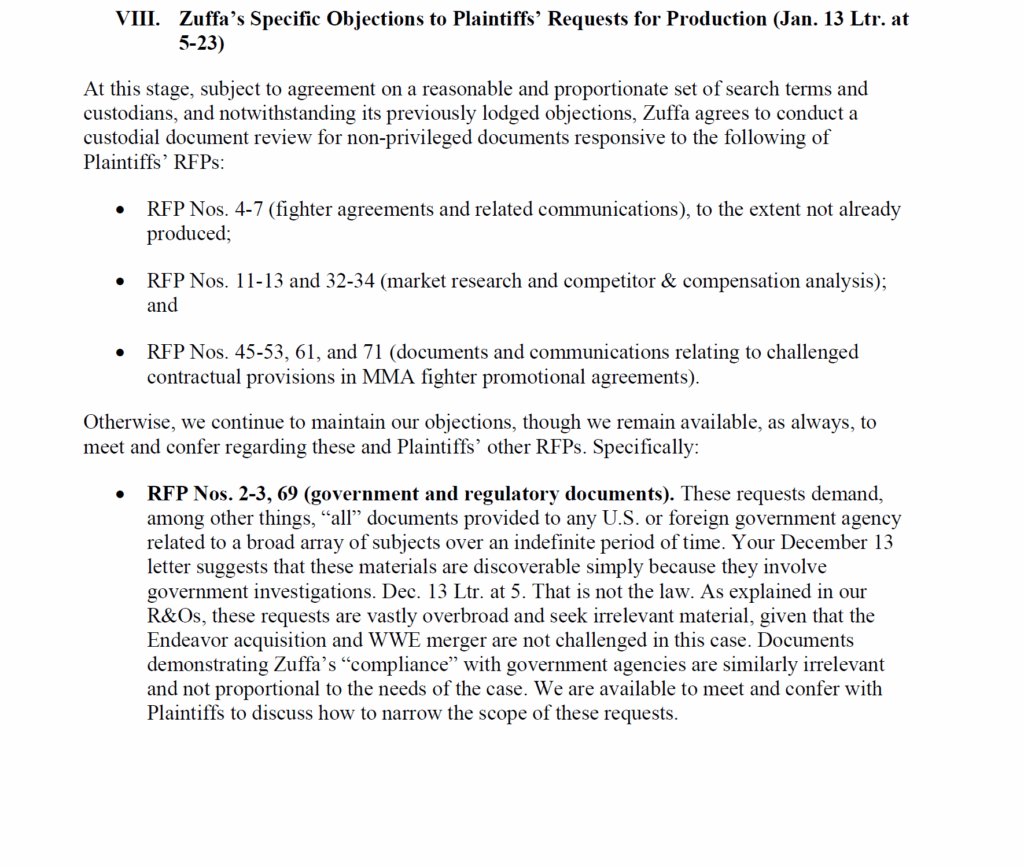 On January 23rd attorneys for defendants Zuffa and Endeavor wrote plaintiffs maintaining its position that most (if not all) of the fact discovery responses and documents had been provided in the Le lawsuit.