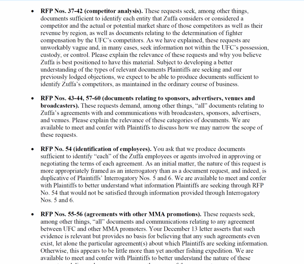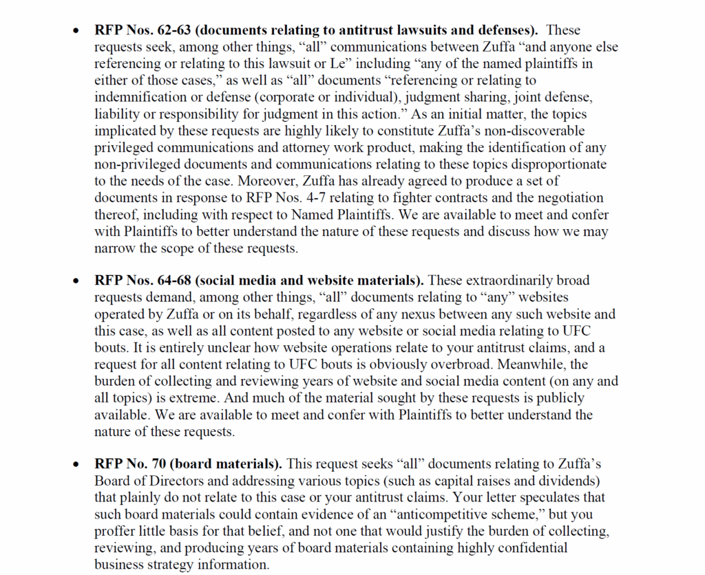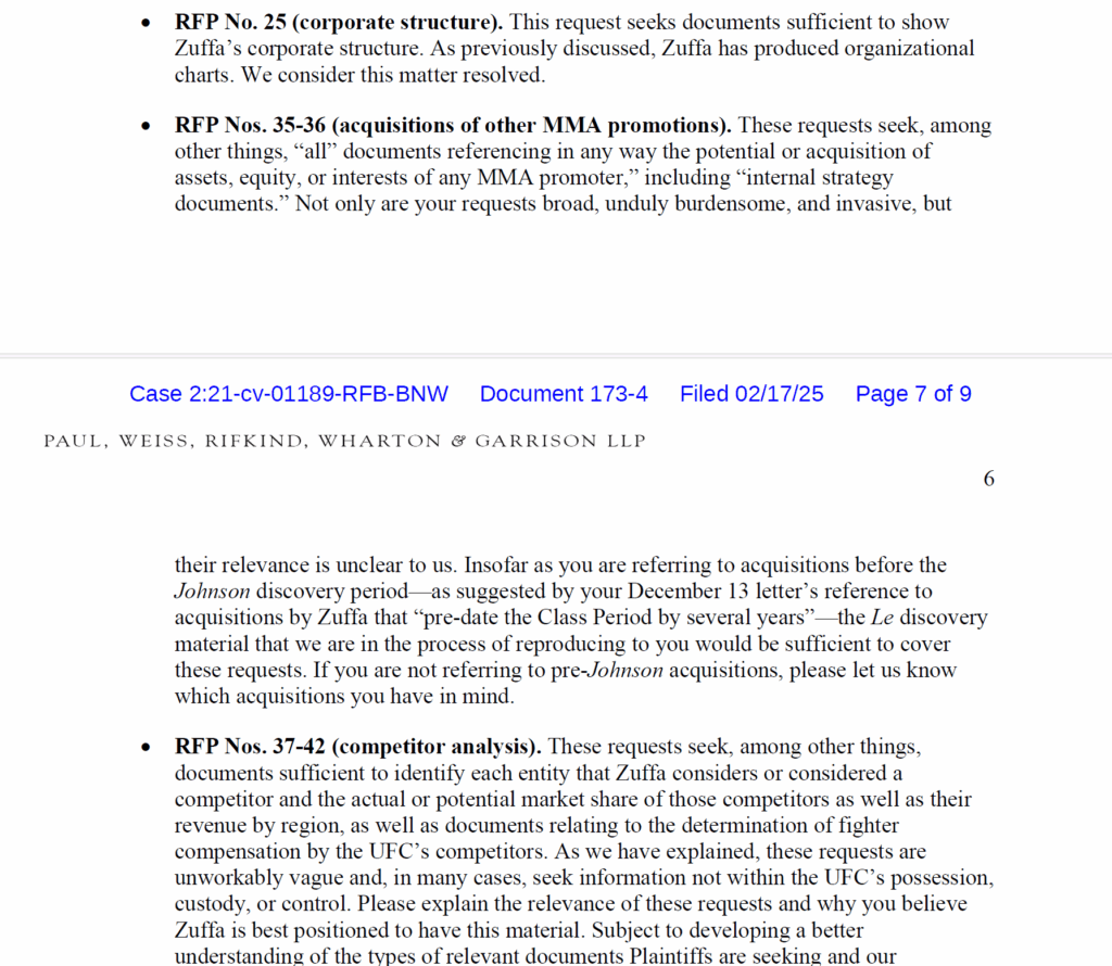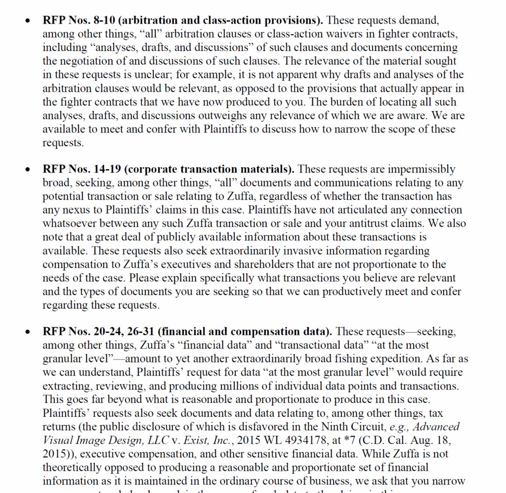 “…we continue to be concerned about the overbroad and disproportionately burdensome nature of Plaintiffs’ 71 RFPs [Requests for Production] to Zuffa.” Jessica Phillips, the attorney at the law firm of Paul Weiss who represents Zuffa wrote. “Plaintiffs are not entitled to a fishing expedition untethered to proportionality principles or the issues actually being litigated in this case.”