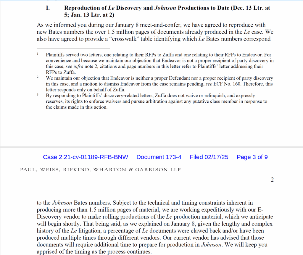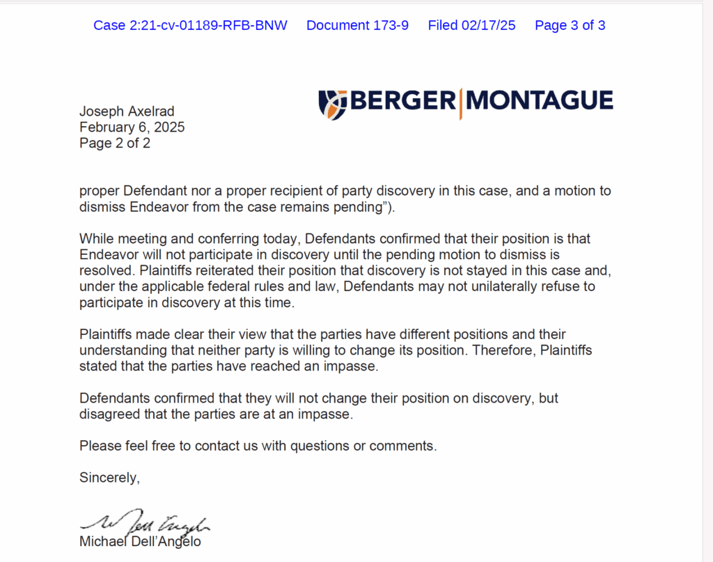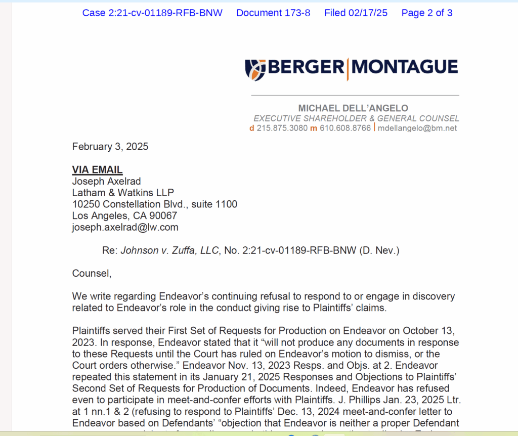Attorney for plaintiffs, Michael Dell’Angelo sent a letter on February 3, 2025 regarding “Endeavor’s continuing refusal to respond to or engage in discovery related to Endeavor’s role in the conduct giving rise to Plaintiffs’ claims.” The letter was in response to Endeavor’s position that it would not respond to discovery from plaintiffs until the Court had ruled on its Motion to Dismiss. A plausible position from the defendants considering that you do not want to expend the time, effort and money in discovery requests that you may not be obliged to provide Moreover, Endeavor does not want to disclose any information of its company that it has to. If you are plaintiffs, you certainly want to continue to conduct discovery as there is a cutoff that the parties have to comply with and if they wait, they may be shut out.