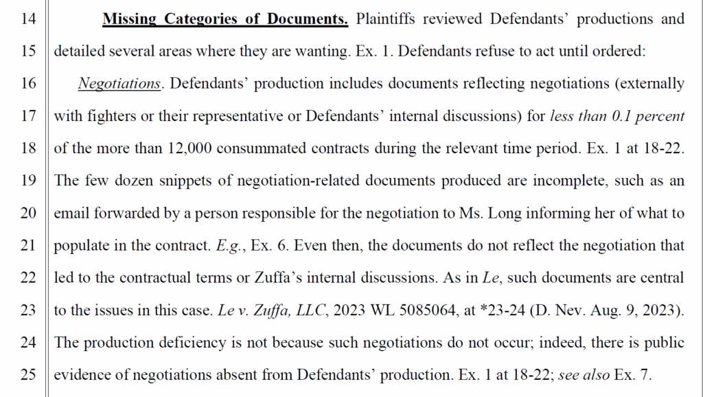 As indicated int he screenshot above, Defendants’ productions are missing categories. Notably, information on negotiations between fighters and the UFC are “incomplete” per Plaintiffs. “Defendants’ production includes documents reflecting negotiations (externally with fighters or their representative or Defendants’ internal discussions) for less than 0.1 percent of the more than 12,000 consummated contracts during the relevant time period. The few dozen snippets of negotiation-related documents produced are incomplete, such as an email forwarded by a person responsible for the negotiation to Ms. Long informing her of what to populate in the contract.” The inference here is that information is missing from the database of documents. Inferring from the inquiry, one infers that Plaintiffs are looking for negotiations between fighters and the parties which might give some context to the allegations of pay suppression which is an overarching theme in these antitrust lawsuits.