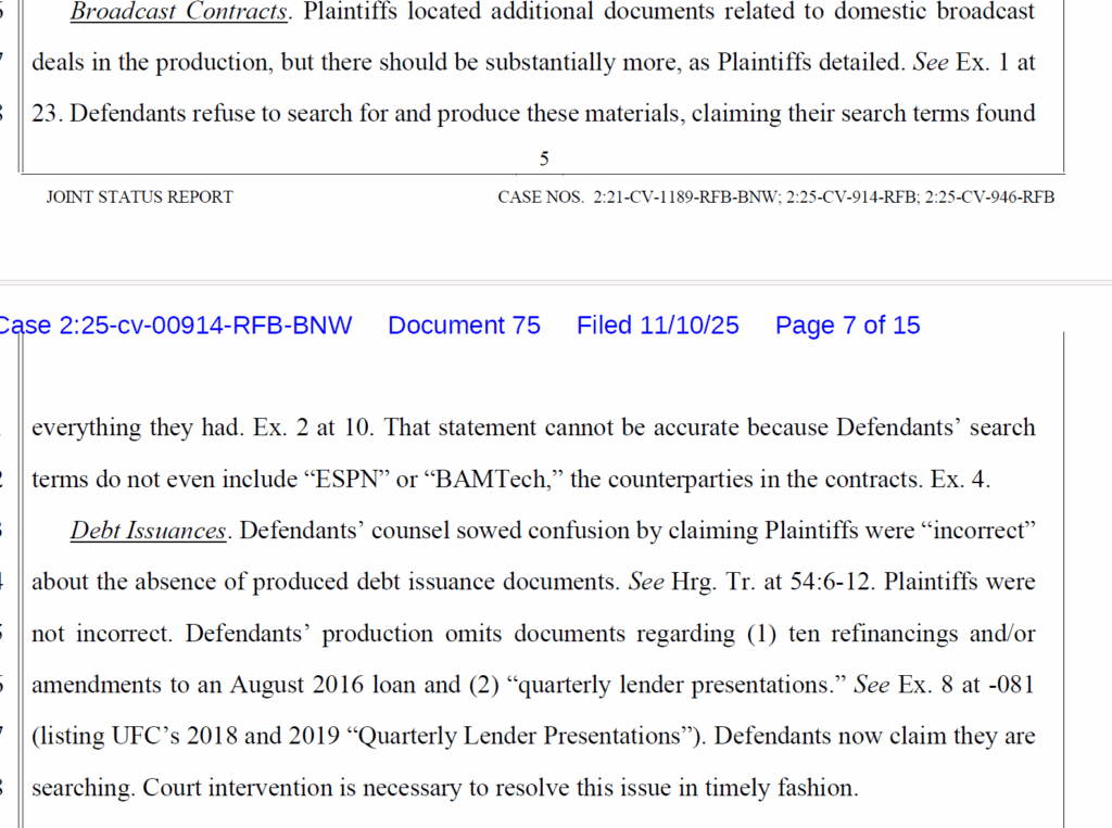 Plaintiffs contend that Defendants’ productions are missing certain categories of documents, including (1) certain fighter compensation data, (2) debt issuance documents, and (3) July 1, 2015 – June 30, 2017 fighter promotion agreements (“PARs”). See Dkt. No. 253 at 4-5. The parties addressed each of these categories during the hearing before Judge Weksler on September 29, 2025 (see Dkt. No. 260 at 48:22-62:25). Defendants have since agreed to conduct targeted searches and produce certain responsive documents Plaintiffs point to in their October Letter, to the extent any exist