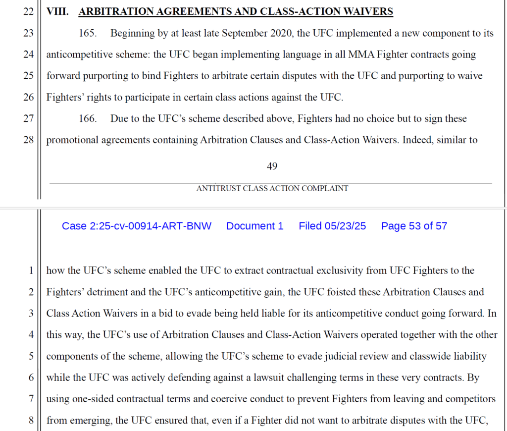 The Complaint appears to be a mirror image of the Le and Johnson cases. However, this one is updated to encompass fighters who had signed the arbitration agreement and waiver amendment to fighter contracts.