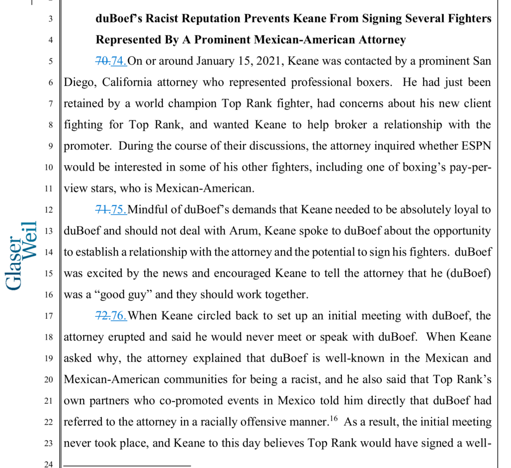 The lawsuit also adds more details regarding a 2019 agreement between duBoef and Keane. According to the allegations, Keane stated that the formation of the agreement for the compensation setup never came as promised from duBoef. Keane asked duBoef in April 2019. The hold-up was allegedly due to duBoef’s team at Top Rank needing to “do some models” in order to develop the right approach. Again, Keane attempted to ask in the fall of 2019 but the excuse this time was due to finding and recruiting fighters that were named to the 2020 Olympic boxing team. In February 2020, Keane was told that duBoef and Top Rank were having difficulty in directing fighters to Keane due to a “signing freeze” by Top Rank and TR was having difficulty having the fighters change their representation to Keane. He learned in April 2022 that duBoef never took any action based on the compensation structure they allegedly agreed to in 2019.
