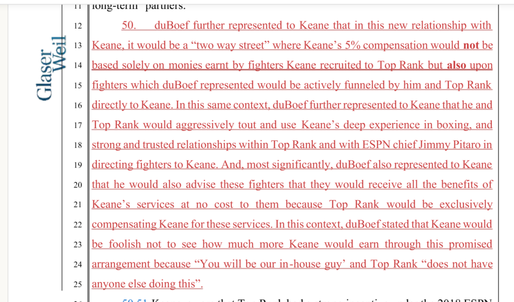 The first big addition in the lawsuit is the allegation that duBoef represented to Keane that his compensation would not only include those fighters he recruited but other fighters would be funneled to Keane directly. This additional perk would not cost Keane anything as it was represented that Top Rank would be compensating Keane for these services.