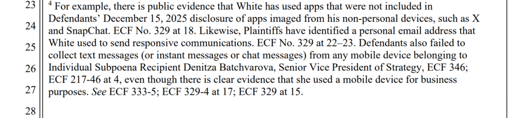 The motion comes prior to a Spoilation Hearing set for February 4th and 5th where both Dana White and Tracey Long must testify about their knowledge of the whereabouts of their phone. Plaintiffs argue that they have a right to look at (among others’) White’s individual phone as there is evidence that he has used it for business use.