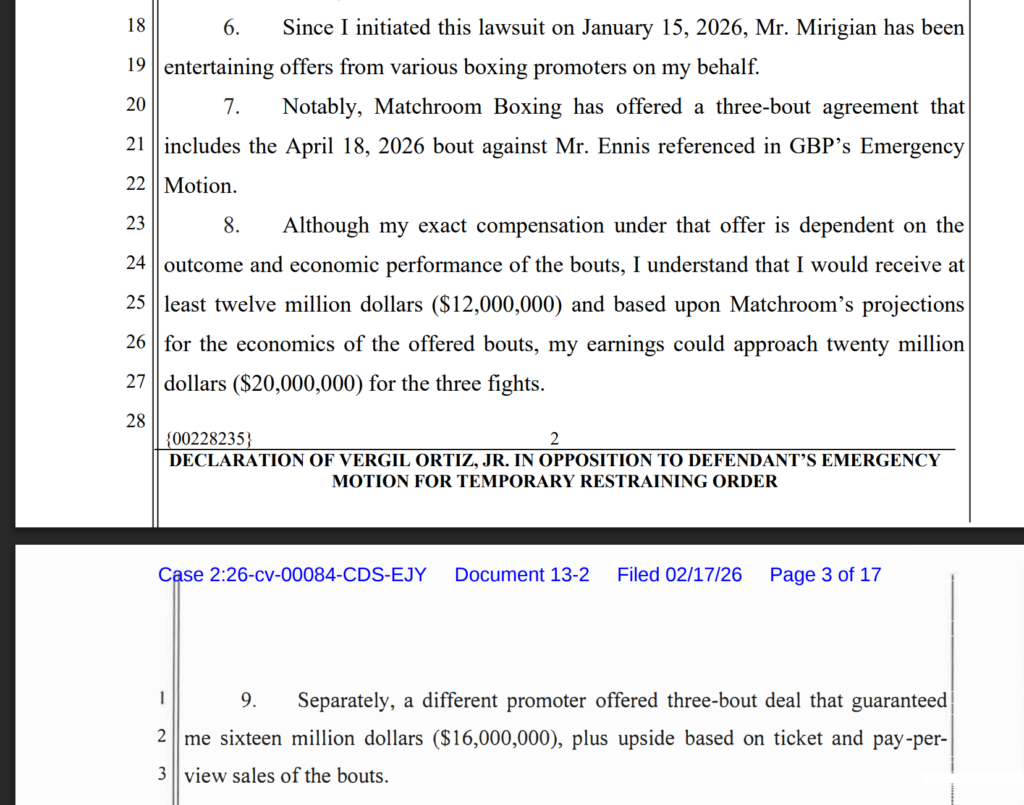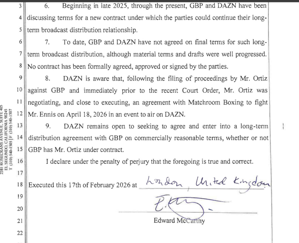 The Declaration notes that while there are negotiations, no term contract “has been formally agreed, approved or signed by the parties.” It also notes that it is aware of negotiations for an Ortiz-Ennis fight tentatively set for April 18, 2026 airing on DAZN.