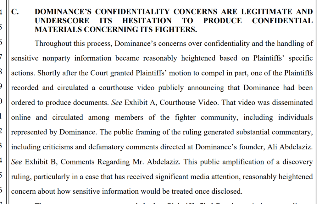 It also argued that they were concerned about the confidentiality process. They cite two specific instances. The first is a document that was filed by Plaintiffs without redaction and not under seal which included private information of fighters. The second included a Courthouse Video which included comments by several former fighters participating in the lawsuit which were negative about Dominance’s founder, Ali Abdelaziz.