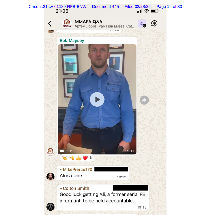 The release of the social media from Plaintiffs has no real legal bearing except it is meant to embarrass. While it does show contempt for Ali by the former fighters involved in the lawsuit, it is not legally contemptable. However, Dominance does make some points in the filing in that the fighters the agency represents are sensitive from personal information being leaked. But, that has to be a matter for the judge and there seems to be a lot of posturing than production going on. One would believe that the magistrate will give a date for Dominance to provide responsive documents and have them produce a detail log of information that is not produced so that the parties may meet and confer on those items. MPO will continue to follow. l